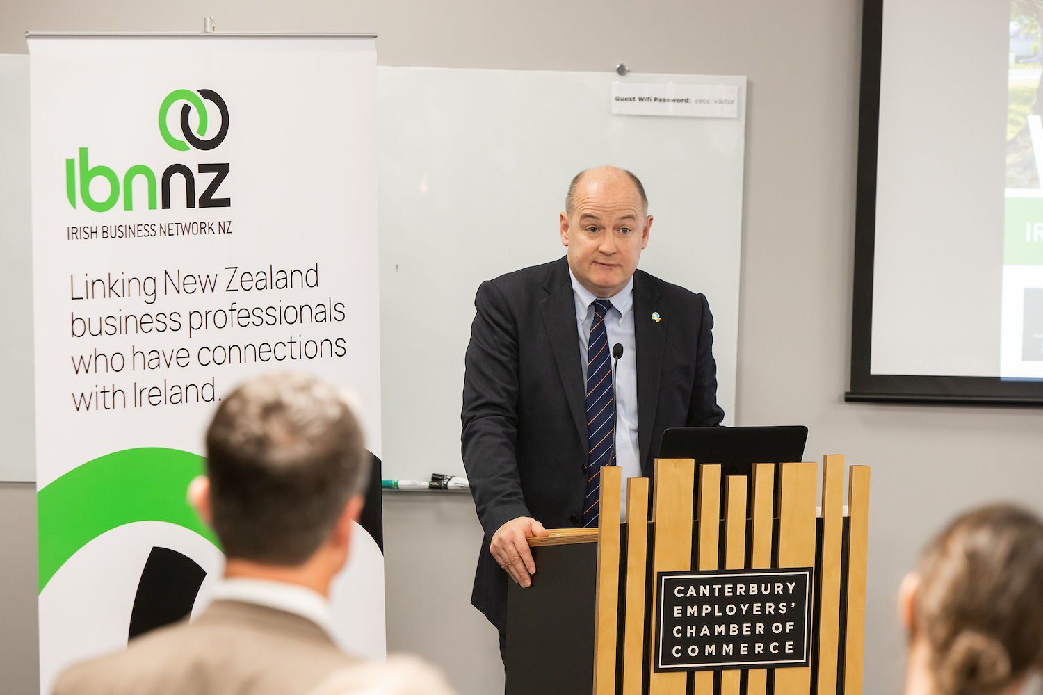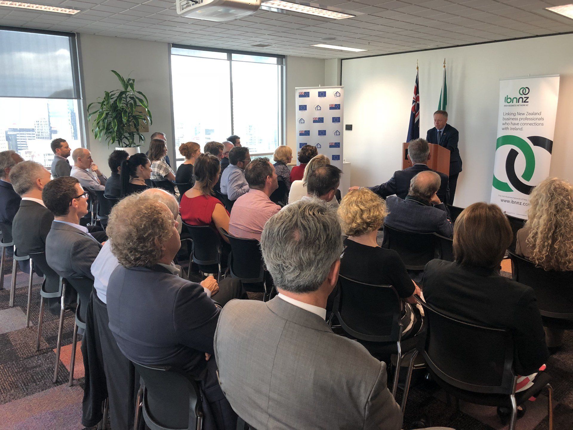 Minister Ciarán Cannon addressing IBNNZ Auckland gathering in Europe House, 2018